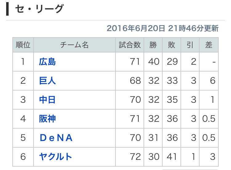 現在のカープ、前半戦、そして交流戦が終わって貯金11、2位巨人までのゲーム差6。しかもその2位巨人でも32勝33敗で借金1。リーグの貯金はすべてカープにある。そんな堂々のセリーグ首位!!交流戦も勝率.647の3位で過去最高らしい。