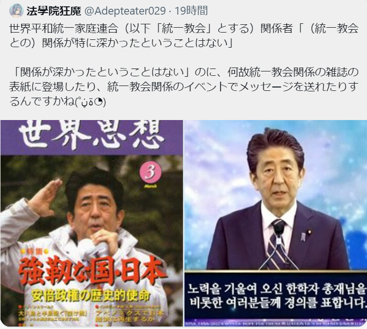 朝日新聞)友好団体=UPFから安倍元首相への協力は?