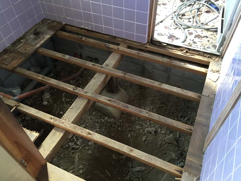和室の畳の下はほとんど大丈夫のように見えたが、1階の奥の2部屋、とくに納戸の間が大引きから腐っておりここは結構大変そうにみえた。他は少し根太を入れ替えればいけそうにみえる。とにかく雨漏りがどこにも無い事だけが唯一の救いだった。おかげで大きく傷んでる所はない。