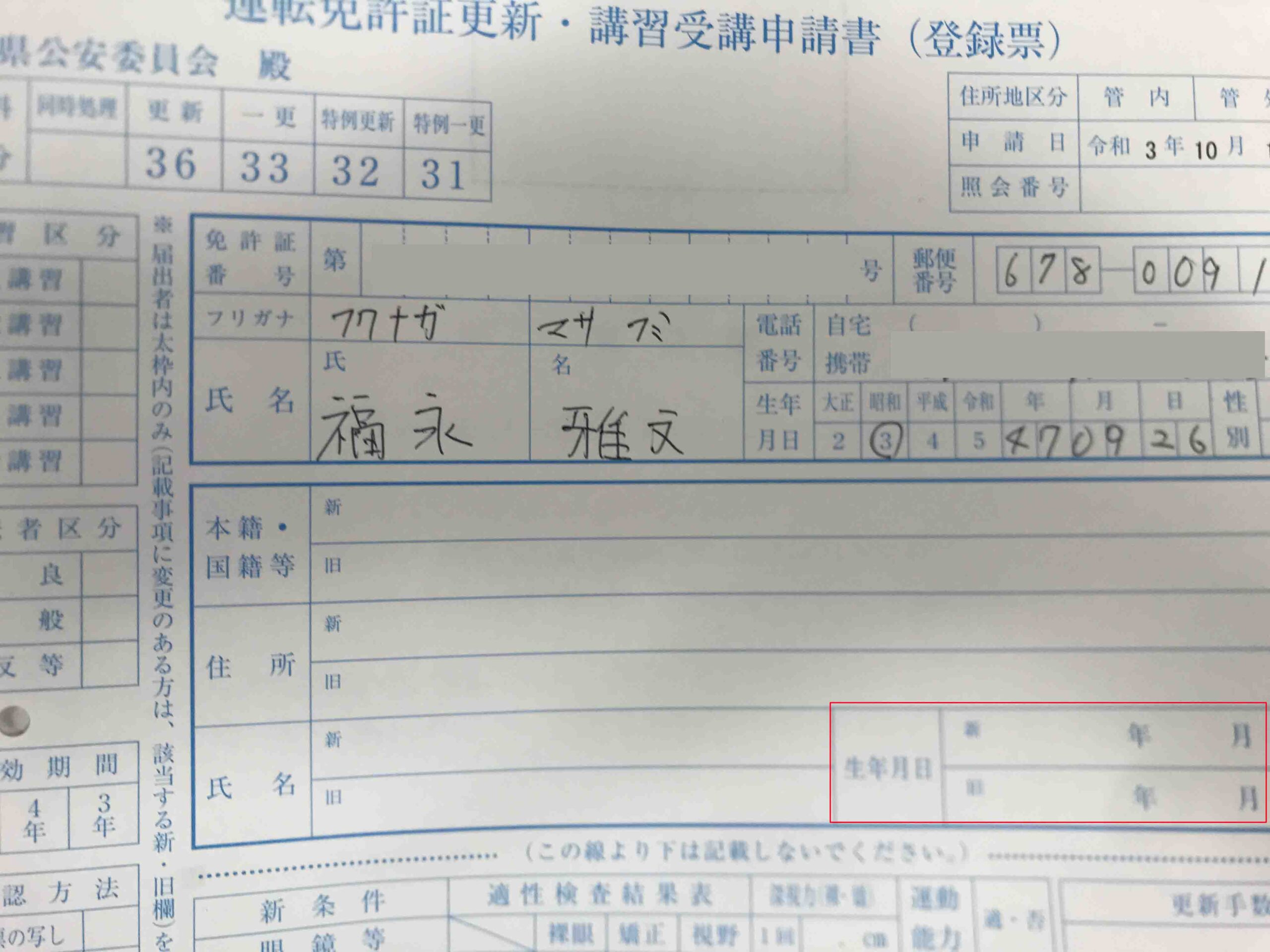 上の太線枠内に必要事項を記入して、下の太線枠内は「記載事項に変更のある方は、該当する新・旧欄を記入して下さい」と書いてあったのだが、ここに生年月日の欄がある。