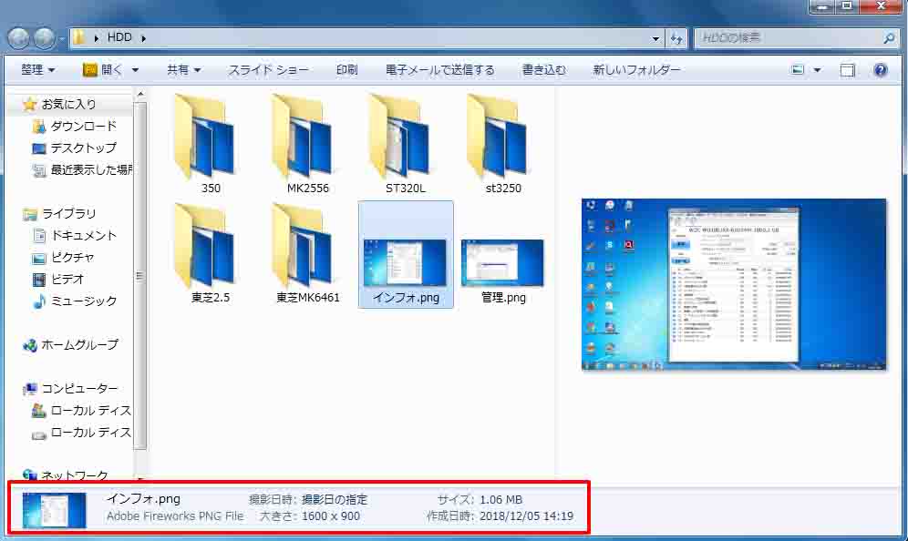 windows7では、上の写真のように、そのファイルのファイル名、日付、ファイルサイズなどの情報がフォルダ下部に表示されていた。