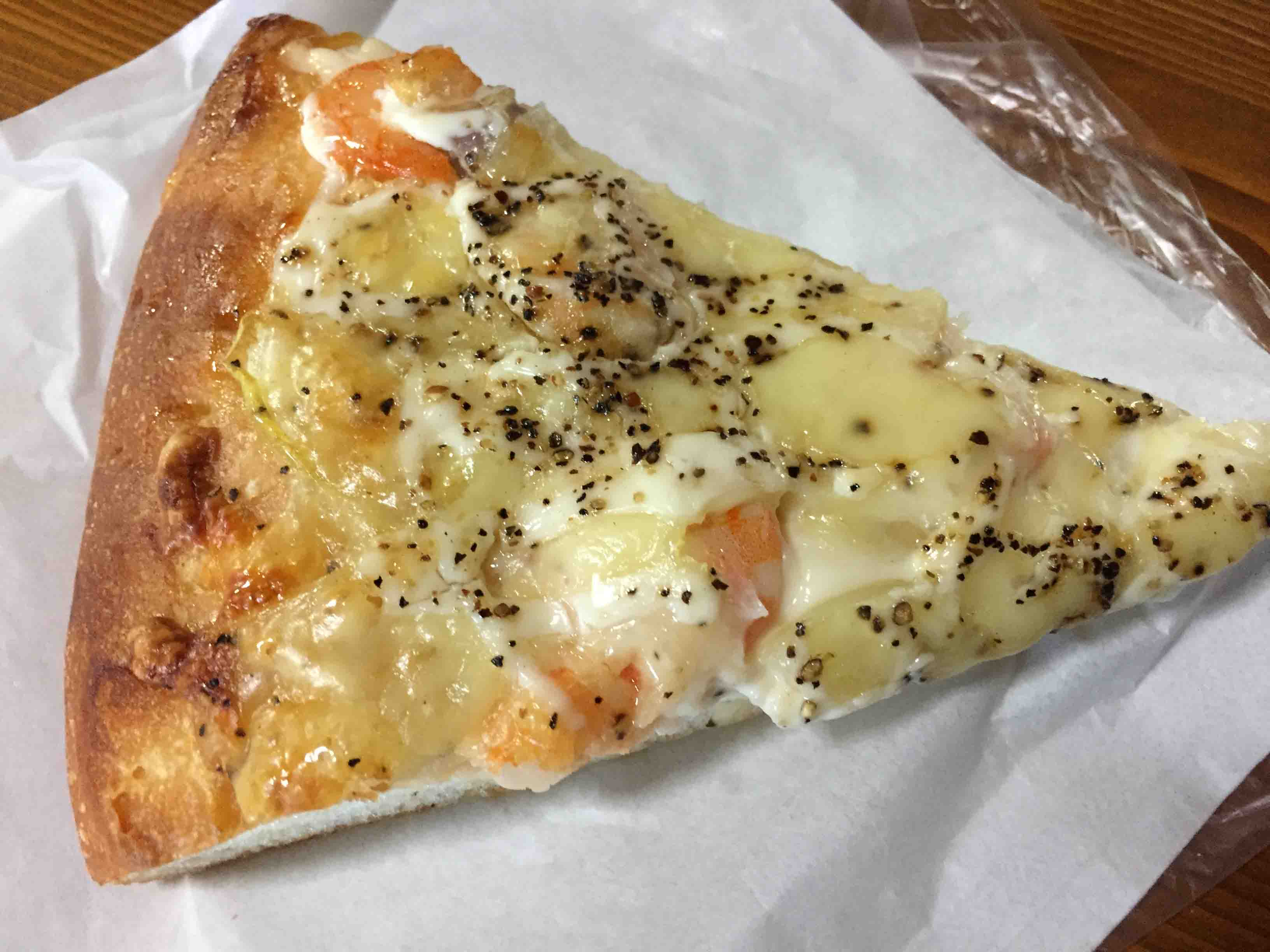 これはシーフードピザ。他にもきのこのピザやら、ツナのピザとか時間によっても色々あったりなかったり。他にもメロンパンや食パンやサンドイッチも美味しい。種類がありすぎて他はあんまり食べたことがないけど。残念なのはサンドイッチが開店直後の時間にないことかな。10時ごろには置いてあると思うが。それでもおすすめのお店です。
