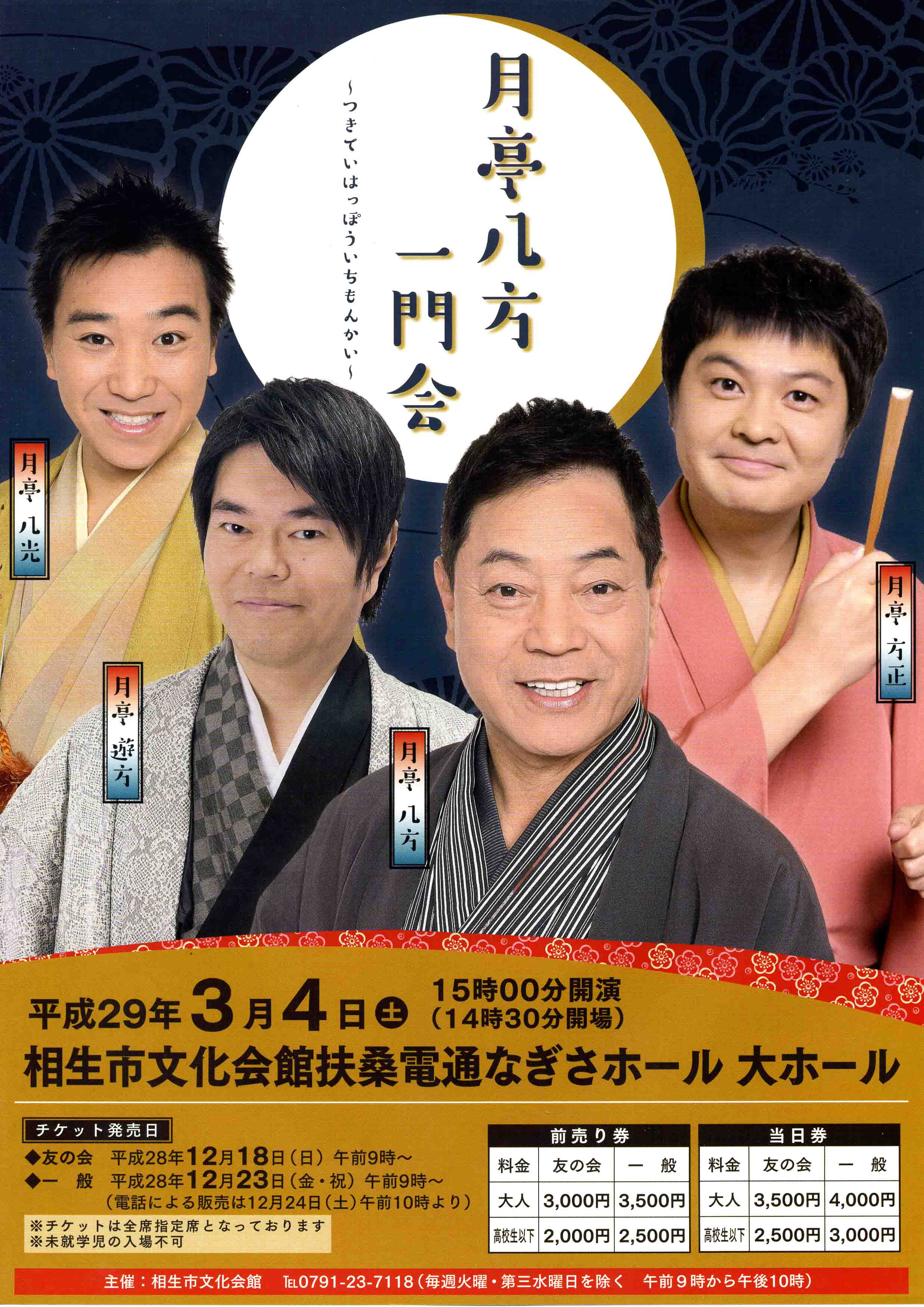 月亭八方さんをはじめ、月亭方正さん、月亭遊方さん、月亭八光さんが出演予定。前売りチケットが友の会に今週の日曜日18日から相生市文化会館 特設窓口で発売される。一般発売は23日から(電話予約は24日10時から)。金額は前売り友の会が大人3000円、高校生以下2000円、前売り一般が大人3500円、高校生以下2500円。当日はそれぞれ500円ずつ割高となる。なお予定枚数に達すれば販売終了。