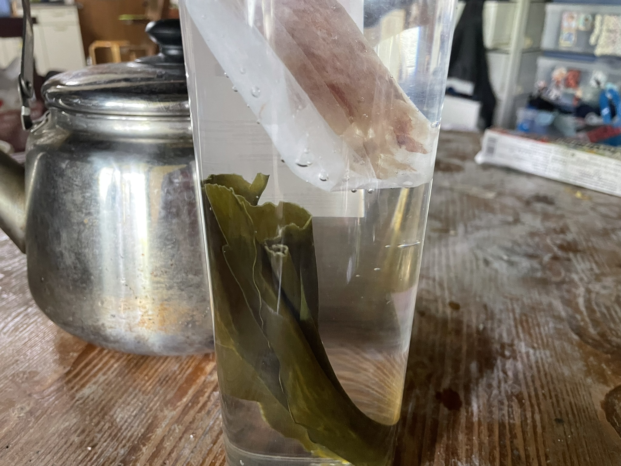 作り方は簡単。昆布をポットに入れて半日以上置くだけ。昆布だけでも良いし、煮干しやカツオ節を入れてもよい。いわゆる出汁水と言われるものだ。