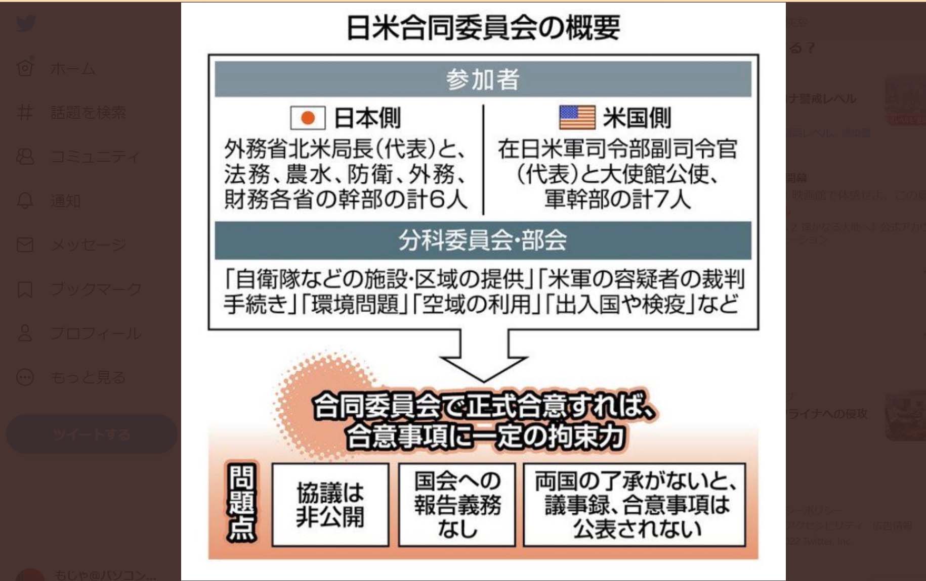 日米合同委員会......協議内容は、両国が了解した範囲に限って公表され、それ以外は、合意事項が何件あるのかすら明らかにされない。国会への報告義務もなく、日程も非公開(東京新聞)