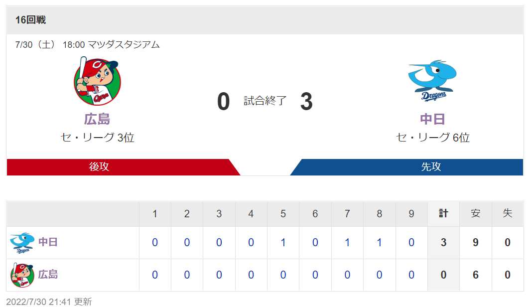 勝利投手 中日 小笠原 (5勝6敗0S)
