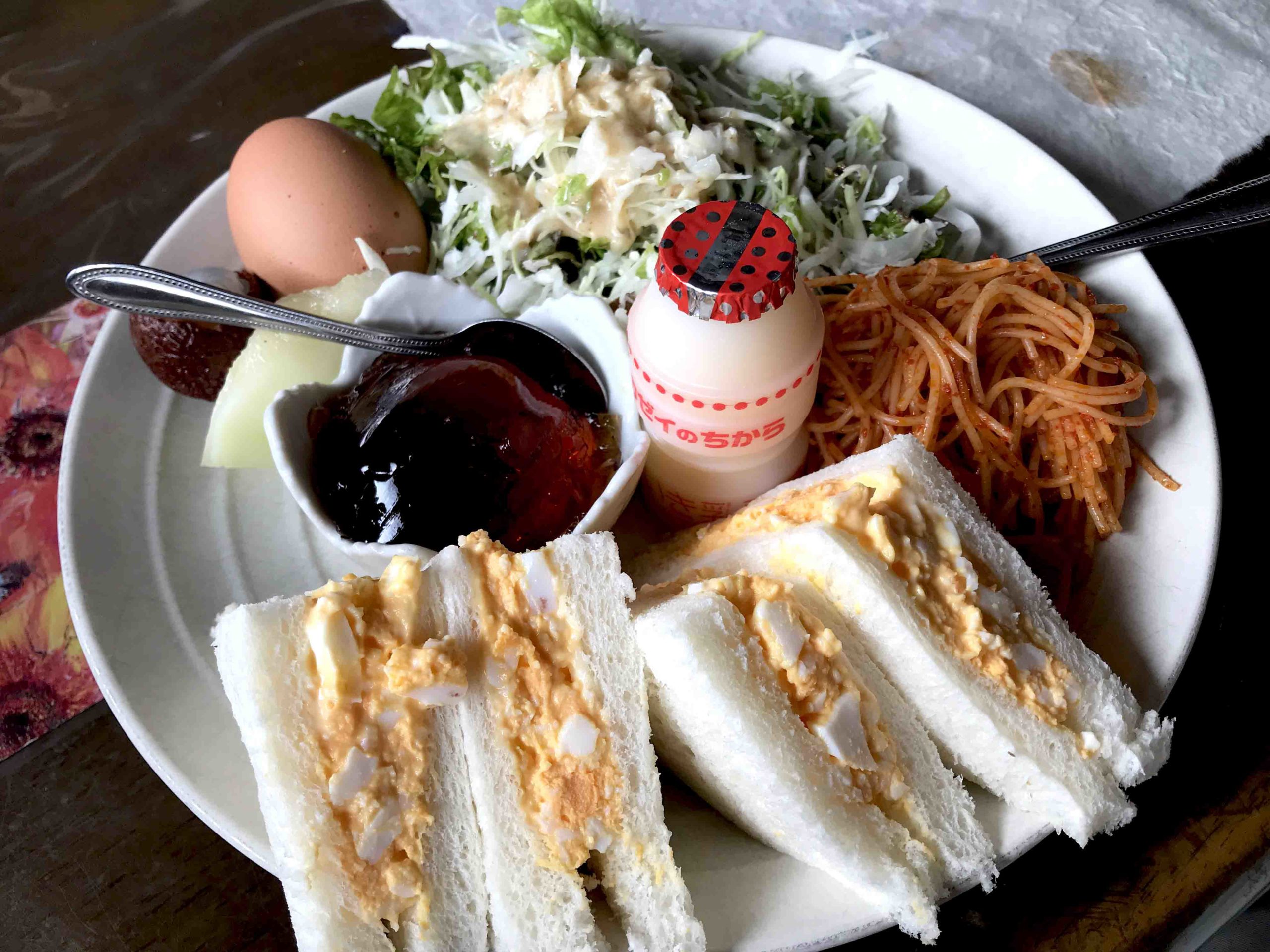 サラダにスパゲティ、ゆで卵にゼリーにヤクルトが付いている。 そういえば、モーニングにヤクルトが付くお店減ったな。最近では珍しいかも知れない。 ランチメニューは11時半から14時。